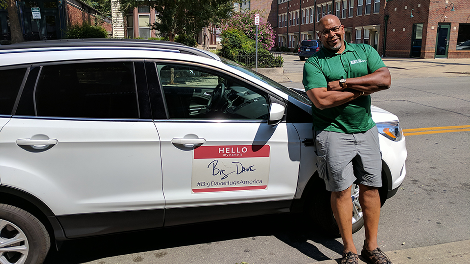 In the week before Dave Sylvester made it to Louisville, he'd been to Minneapolis, Chicago, Milwaukee and Indianapolis. He'd driven some 700 miles just that week in his white SUV, a sign on the door made to look like a nametag: "Hello, my name is" printed on a red strip at the top above "Big Dave" in cursive, #BigDaveHugsAmerica at the bottom. Since setting out from his home in Philadelphia on June 26, he'd been to more than 50 cities. By the time he made it to Kentucky last Saturday, he had clicked the little clicker counter he carries up to nearly 11,000.
