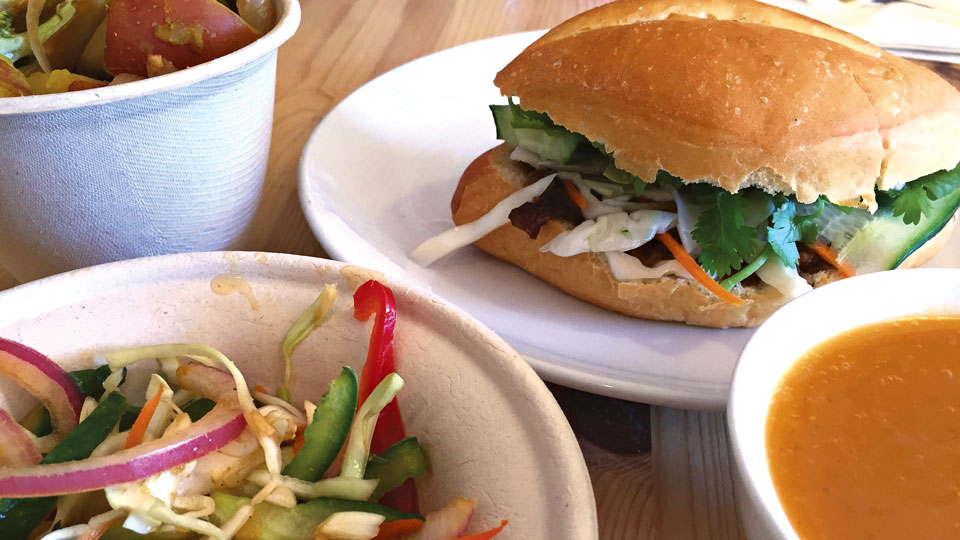 A glass case of desserts catches my eye, but I look up at the back wall — chalkboards full of meat-free, dairy-free, gluten-free and oil-free options, like a raw taco salad, jackfruit barbecue sandwich and black-eyed pea burger. I rat-a-tat-tat one healthy decision after the next: raw pad thai, báhn mì sandwich, pumpkin soup and a petite combo plate of curry potatoes, barbecue tofu and stir-fry vegetables that, through some wizardry, are oil-free.