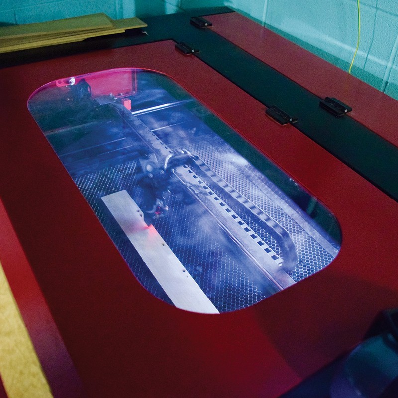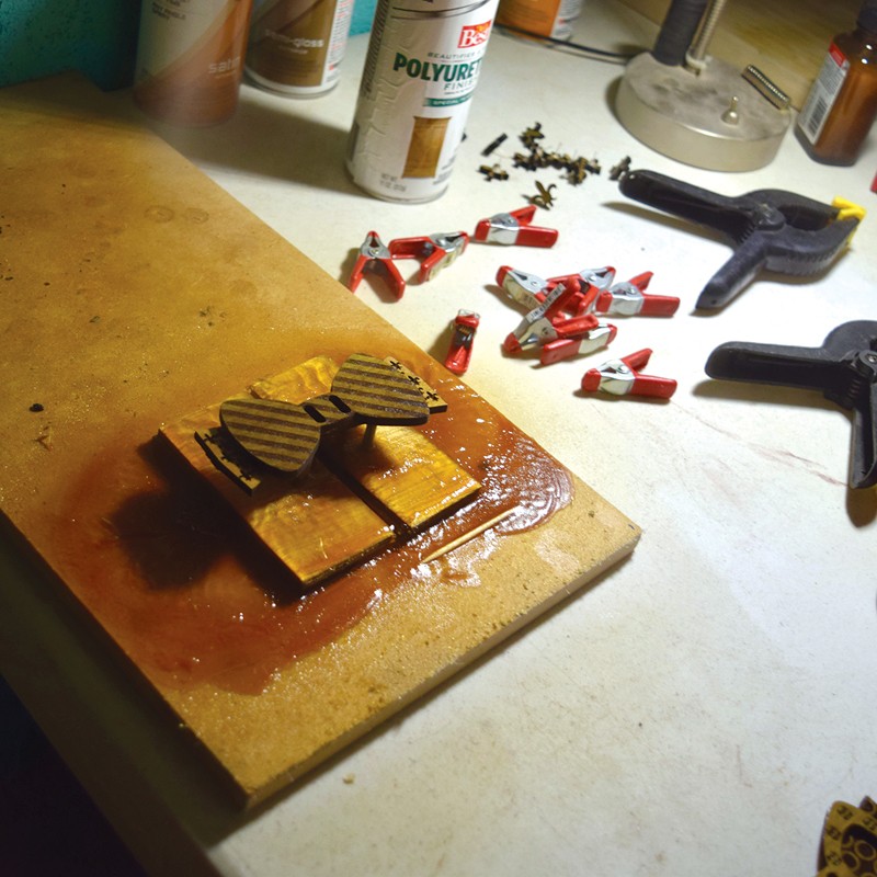 To begin, Hackbarth takes wood to FirstBuild at U of L, where she can use “all the big power tools.” A table saw slices the wood into foot-long strips as thin as five millimeters. Back at StoryWood’s 800-square-foot workshop on Myrtle Street in Old Louisville, Hackbarth places a wood strip inside a hefty laser-cutting machine that she calls “Betsy.” “If you give them a name, they like to work with you better,” she says. On a computer, she selects one of the 14 designs ranging from fleurs-de-lis to horses. “This cut will take about 20 minutes,” she shouts over an industrial humming noise. Clamps, wood glues and aerosol cans clutter a plastic folding table. Hackbarth uses three different kinds of sandpaper to smooth and polish each lasered piece. A lime-green toothbrush removes residual dust from crevices. Then she glues pieces together. “Sometimes I use Super Glue on the tiny pieces. I also use Wood Fusion or, if it’s a really tough piece, contact cement,” she says. She seals it with polyurethane on the back, shellac on the front. “Then they go in the drying box,” she says with a laugh, pointing to a Louisville Slugger cardboard box with a purple UV lamp sticking out of one end. Each piece gets five to seven coats.