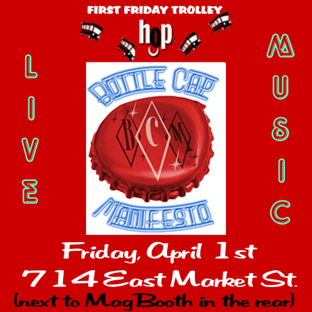It's April Fool's night this Friday, April 1, 2011 on the First Friday Trolley Hop. But this is no joke. Come out and catch some live music with Bottle Cap Manifesto, the latest Louisville Indie Rock Band, playing for your enjoyment. Refreshments will also be served.