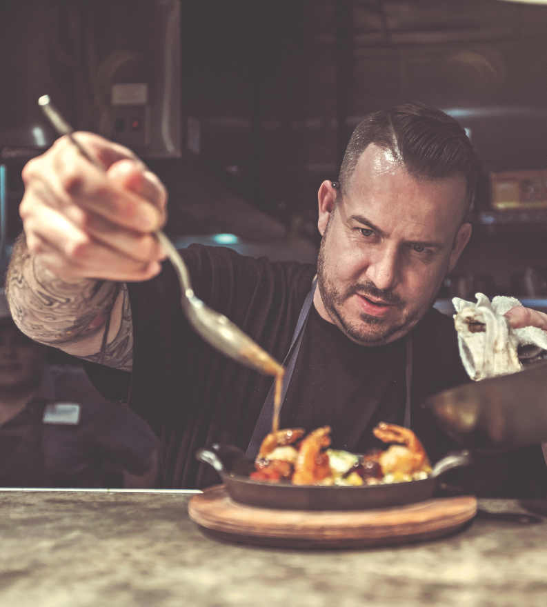 The fashion world was tough to break into, he says, but he landed apprenticeships in some upscale-casual New York restaurants to make ends meet. “I slowly drifted away from fashion and found a home in restaurants. When you’re with people for 14 hours a day, they become like a family to you,” he says. He returned to Louisville in the early 2000s and worked in some of the city’s best kitchens, including Seviche. In 2010 he opened the Highlands late-night pizza joint Papalinos — his nickname for his mom that’s also tattooed on his arm. (Though he still consults with the Papalinos owners, a couple years ago Rosenberg sold his share of the company, which now has one location, in Springhurst.) In the basement of the original Mussel and Burger Bar in Jeffersontown, he opened the Place Downstairs (later called Cena, now closed).