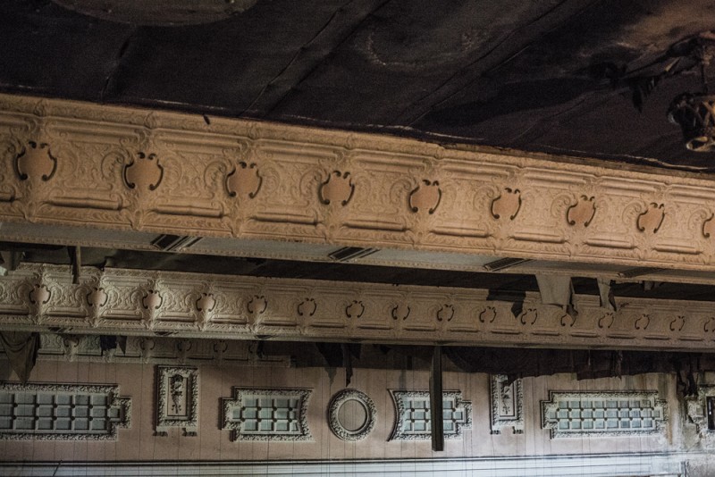 Upstairs, though, the past remains. Plaster crumbling away from brick, still clouds of dust in the air. The pair of old projectors stand in the little room up top, chimneys elbowing up from them, and beside them what looks like an old switchboard for stage lights still marked up in chalk by a hand likely gone from this world. And then there’s the stage, a grand proscenium, filigree above it presided over by a faded gold eagle. There was once a grand organ here, though the Flood of ’37 ruined it. Theater, vaudeville, movies, rock bands playing so long ago a newspaper would still refer to ZZ Top as “a group called ZZ Top.” Black Sabbath played here. Also Christian movies for Sunday school. Also porn.