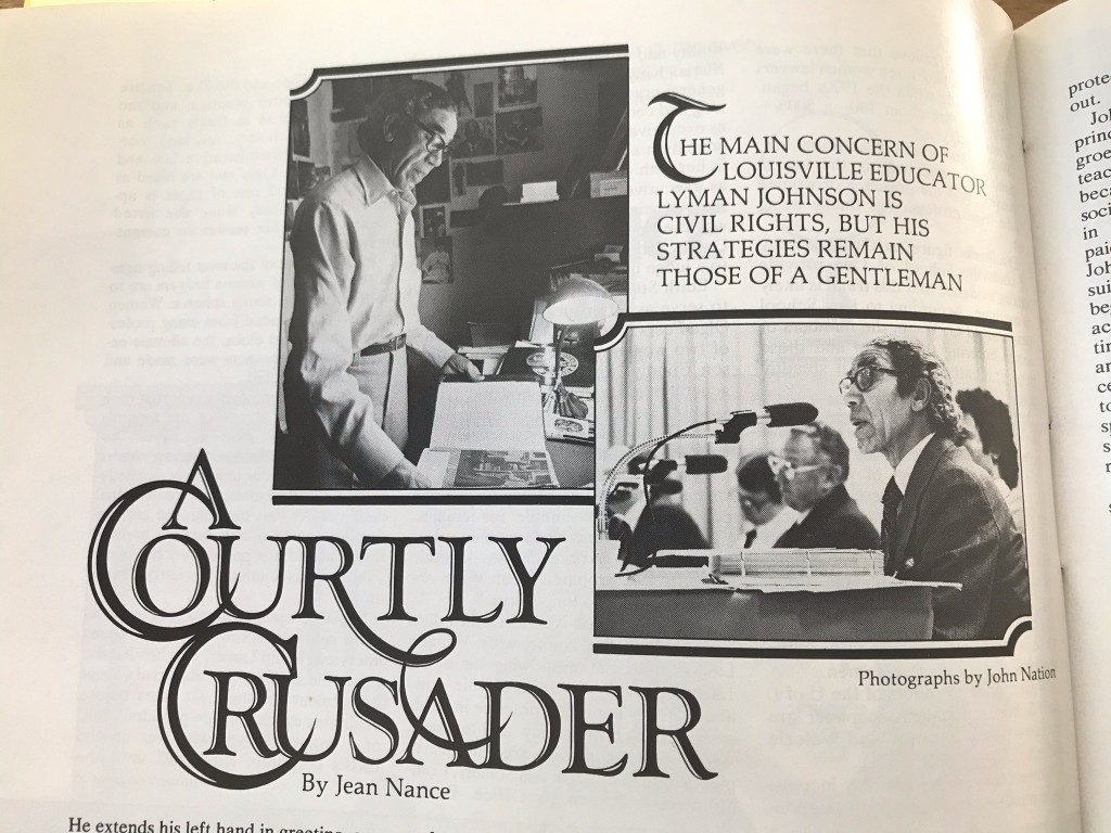 A June 1979 Louisville Magazine story profiled educator and civil rights activist Lyman T. Johnson, who was 72 at the time (he died in 1997 at age 91) and had spent “some 40 years of struggle to open Kentucky’s facilities and opportunities to black people.” When asked for his “forecasts for inter-racial relations in the next quarter-century,” Johnson said, “I predict that the gains in inter-racial relations will continue to improve. Gains already obtained will be jealously guarded; they will not be surrendered without serious, perhaps violent, protest. Improvement will go forward — I would hope peacefully. But I do not rule out the possibility of some violence if constitutional rights and simple justice are blatantly hindered or denied to minorities.”