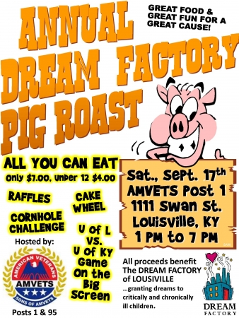 Come on out for an ALL YOU CAN EAT Pig Roast with Raffles, Corn Hole Challange, Cake Spin, and the Big Game on the Big Screen. All proceeds benefit The Dream Factory of Louisville.