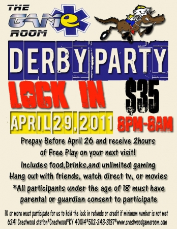 The Game Room in Crestwood is holding a Derby Lock-In. Cost is $35. This includes unlimited gaming, unlimited pool, food and drinks provided. All night gaming, internet ready, play online if you have an xbox live account, ps3 and wii. Choose from hundreds of games to play. Bring a movie and watch it with your friends in our semi private rooms. Come purchase your spot by the end of April 27, 2011 and receive 2 hours of additional game play on your next visit.