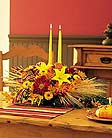 With two taper candles, fresh flowers and wheat, this lovely fall centerpiece is sure to light up any table setting, especially Thanksgiving.